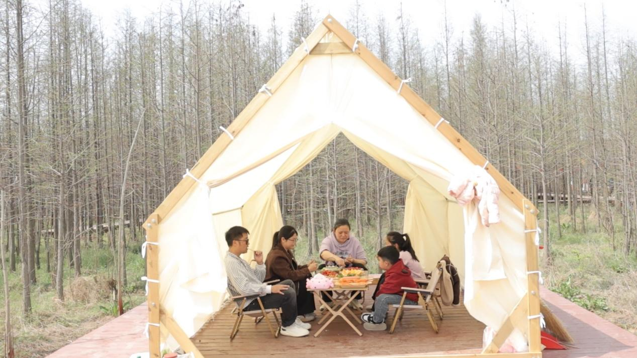 清明时节,湖北省老河口市仙人渡镇李家染坊村的水杉林栈道旁,新开辟的露营基地成了这个春天最热闹的去处。大大小小的帐篷错落分布在林间路旁,帐篷外,金灿灿的油菜花海开得热烈。