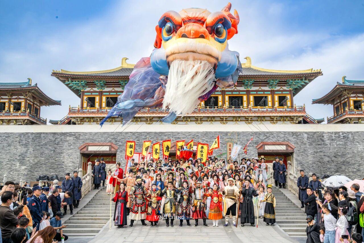 唐城的夜色在歌舞中“绽放”,夜游项目《盛世唐城之大唐倚梦2》升级回归:《明德奏凯歌》鼓声震天,武士列阵迎宾;《朱雀展国威》旌旗猎猎,尽显盛唐气象;《乐舞胡旋》舞姿曼妙,带来浓郁西域风情。春节期间曾火爆出圈的巨型鳌鱼再度返场,蓝眸炯炯,白须轻扬,在仿唐建筑的飞檐间自在“游弋”,宛若梦幻。