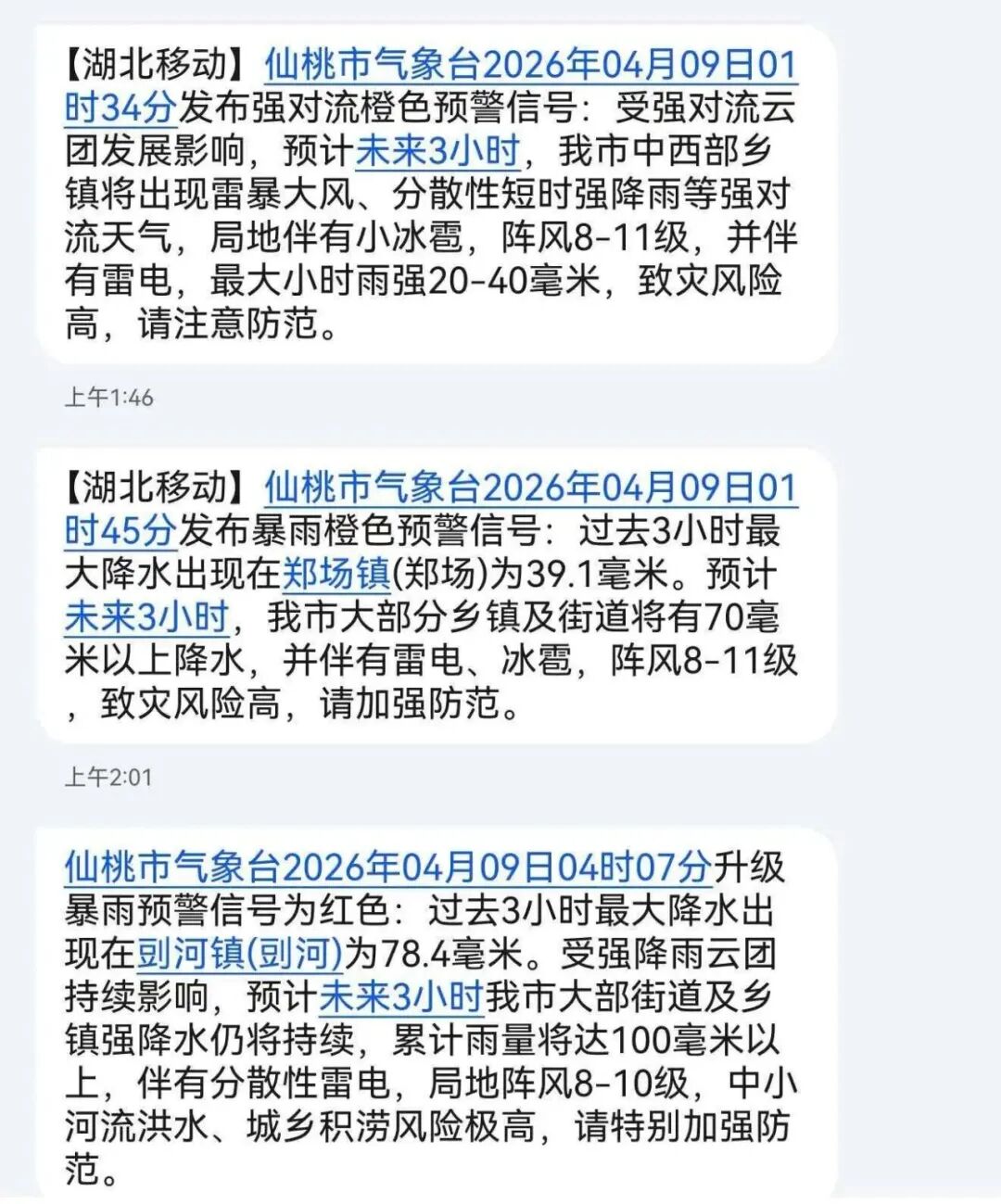 据市气象局消息,4月8日20时至4月9日08时,全市平均雨量85.3毫米,最大雨量为115.9毫米,出现在剅河镇;其中降水较大的还有周帮114.1毫米、沙嘴街道113.5毫米、郑场113.1毫米、郭河111.7毫米,全市超过100毫米的站点共12个。市气象局及时启动重大气象灾害(暴雨、强对流)IV级应急响应,此次过程,共发布暴雨红色预警信号1次,暴雨橙色预警1次,强对流橙色预警1次,强对流黄色预警信号1次。