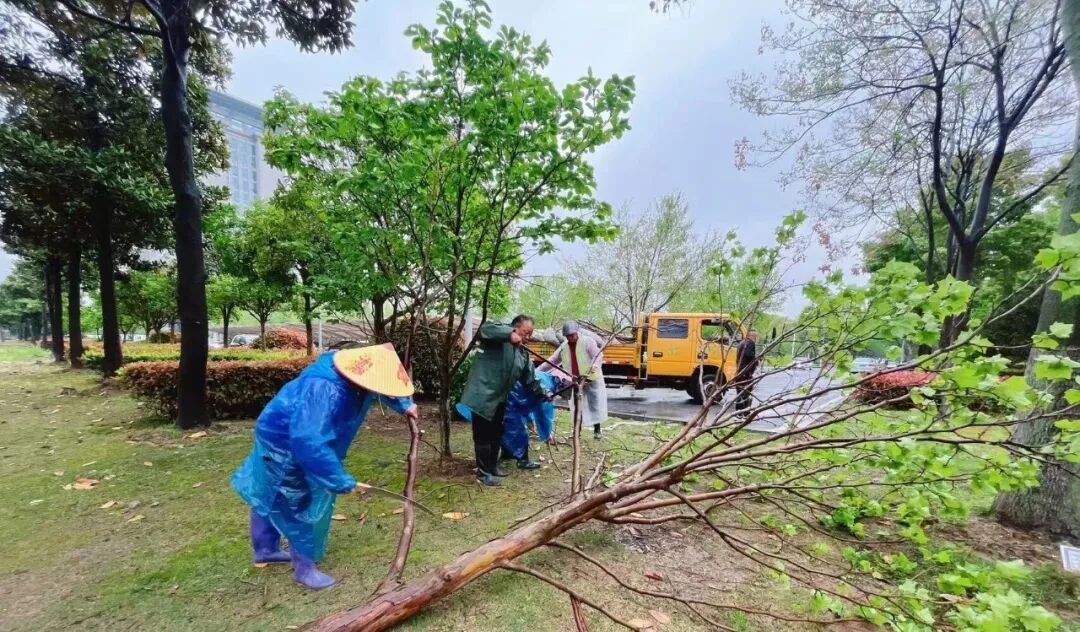 市林业事业发展中心辖仙怡养护公司和公园管理处迅速启动应急预案,由23人组成的应急小分队分5组带领416人的网格人员进行巡查排险排涝,现已扶正倒树61棵,清理断枝36车次,15台潜水泵进行排涝,确保行人安全和道路畅通及苗木损失降到最低值。