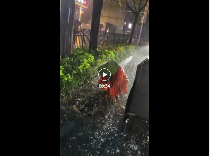 凌晨4点,天未破晓、雨势正酣。环卫城西片片长张启访已带领十余名环卫工人奔赴城区主次干道。他们头戴斗笠、身披雨衣、脚蹬胶鞋,在齐踝深的积水中逐段排查。面对被落叶、杂物堵塞的落水口,队员们徒手扒开堵塞物、清扫路面积水,争分夺秒为早高峰市民开辟“安全通行路”。