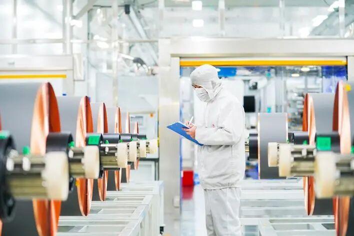 襄阳高新区骆驼新能源低碳产业园生产车间,工人正在检查生产记录