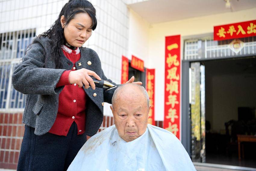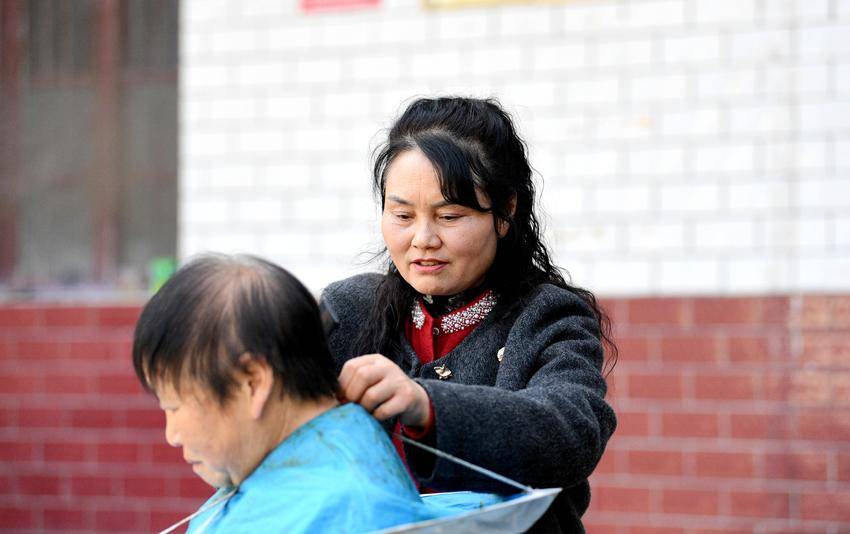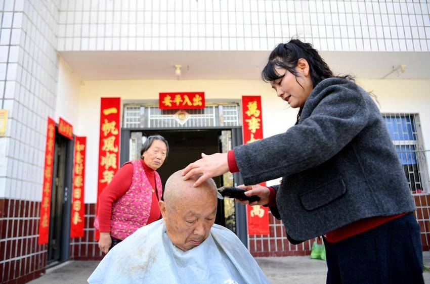 春日的暖阳温柔地洒在农家小院里,73岁的留守老人罗斗菊端坐在椅子上,谭玉玲俯身为她围上理发围布,手中的推剪轻轻滑动,动作娴熟而轻柔。“想剪长还是剪短?”谭玉玲问,罗斗菊笑着回答:“剪短一点,我干事麻利些。”