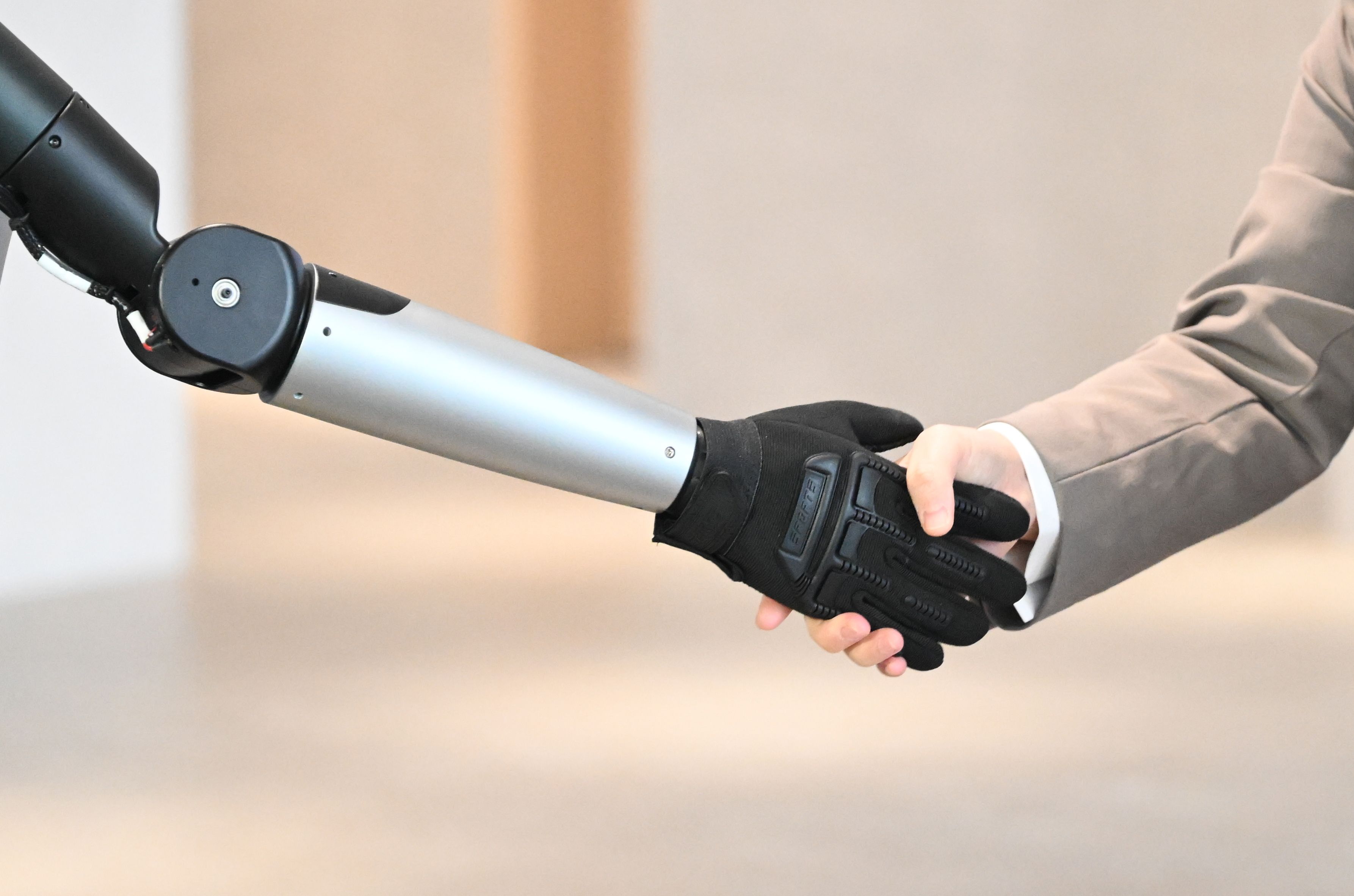 经过训练的工业人形机器人与人握手。新华社 摄