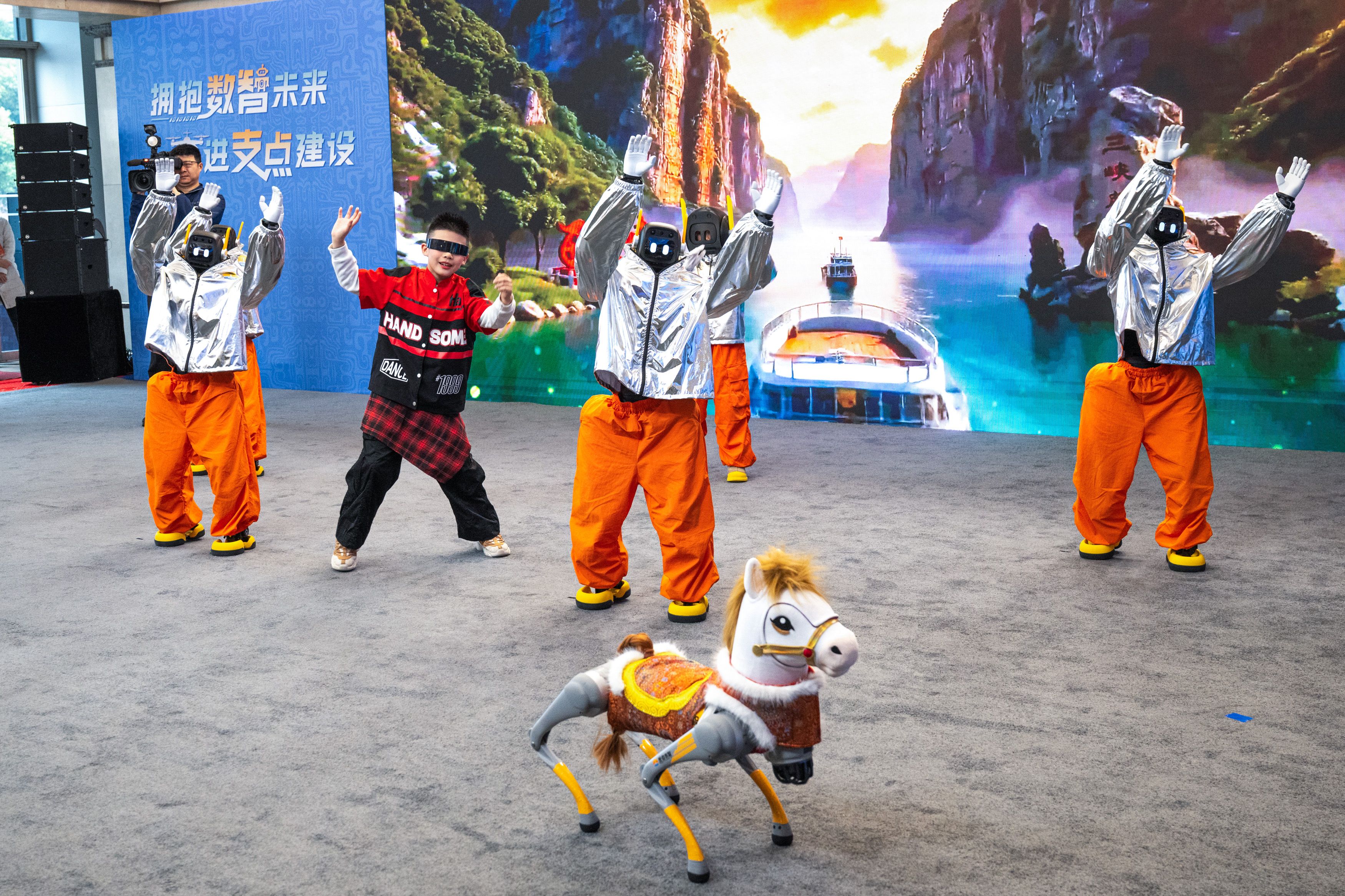 小朋友与人形机器人一起表演。新华社 摄