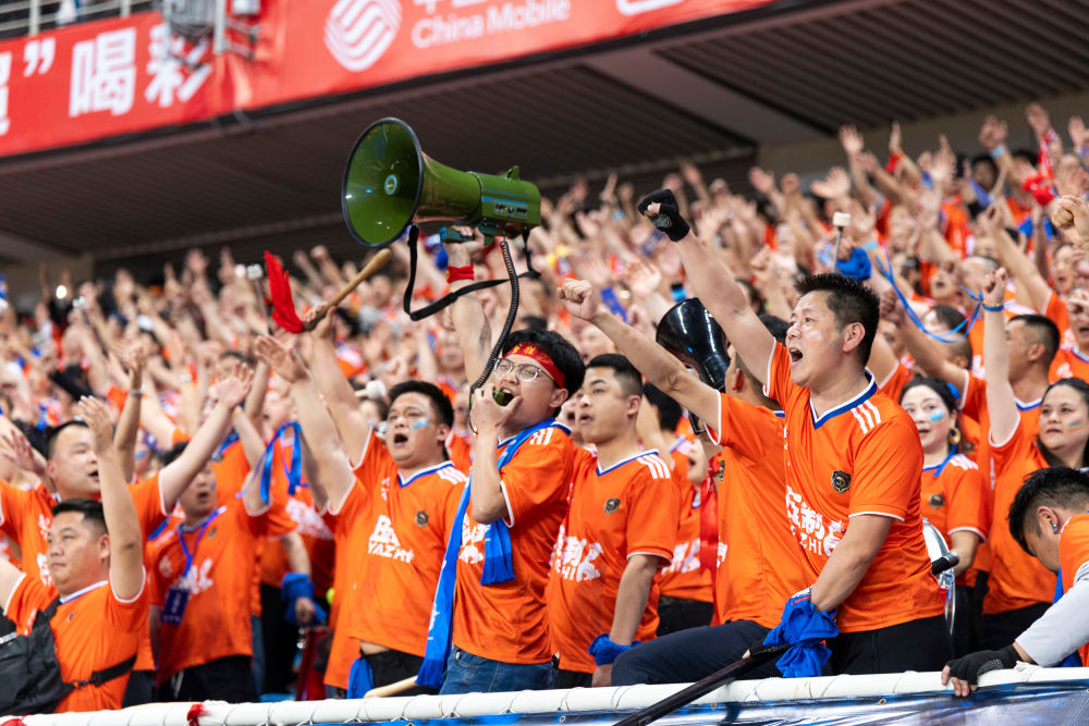 身着战国袍的荆州队球迷在看台上为球队加油助威。新华社记者伍志尊 摄