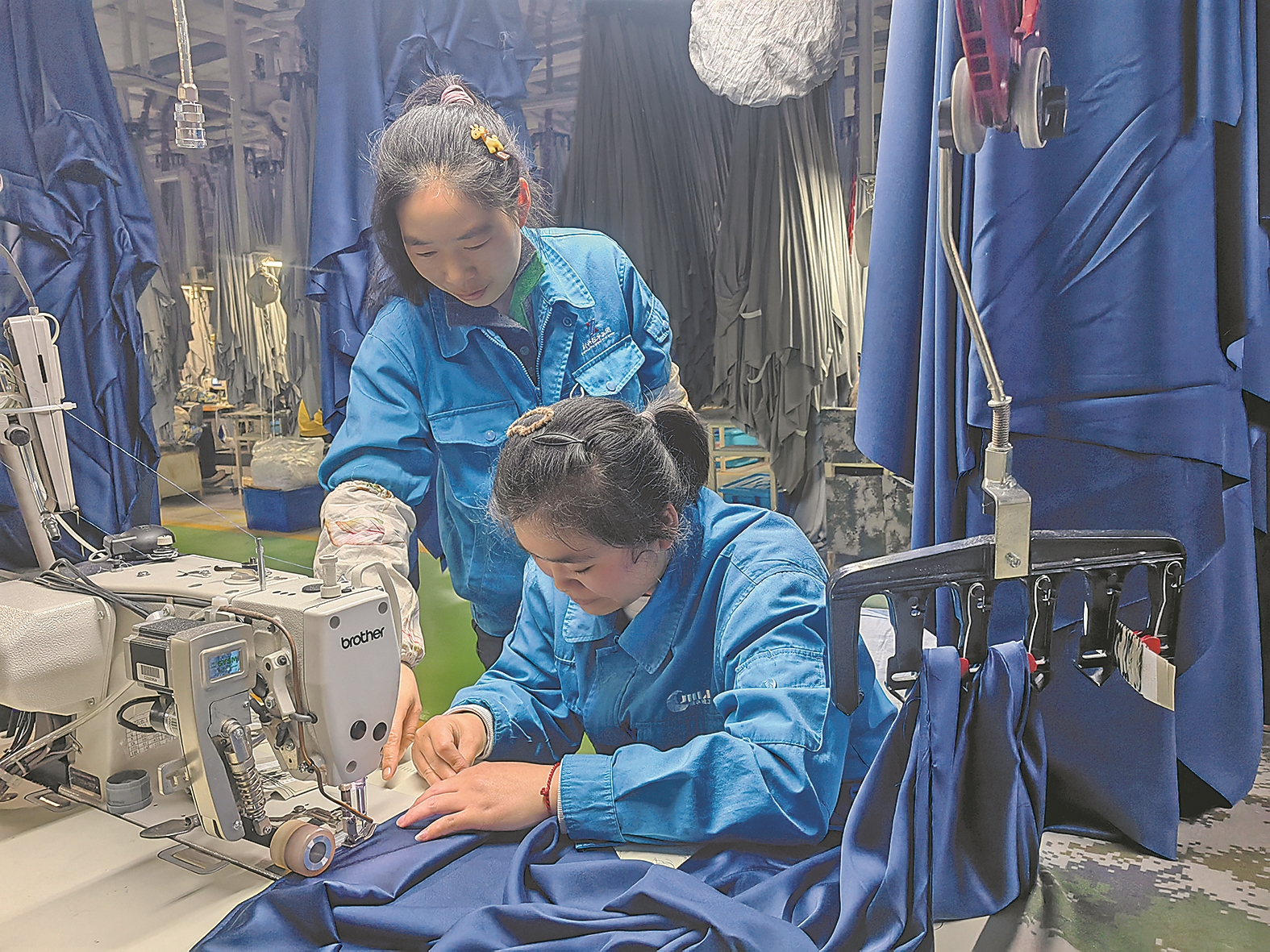 4月9日,际华三五四二纺织有限公司劳动模范隋成成(左)与缪来凤相互学习操作技能。为充分发挥劳动模范示范引领作用,该公司组织开展“劳模互学”专项交流活动。不同岗位的劳动模范骨干打破专业壁垒,通过现场观摩、案例研讨、经验复盘等形式,交叉学习先进操作法与创新思路。通讯员 陈培 摄