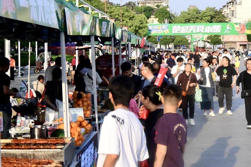 4月18日,楚超美食市集在襄阳体育场外吸引众多游客观众前来品尝。记者 乔森垚 摄