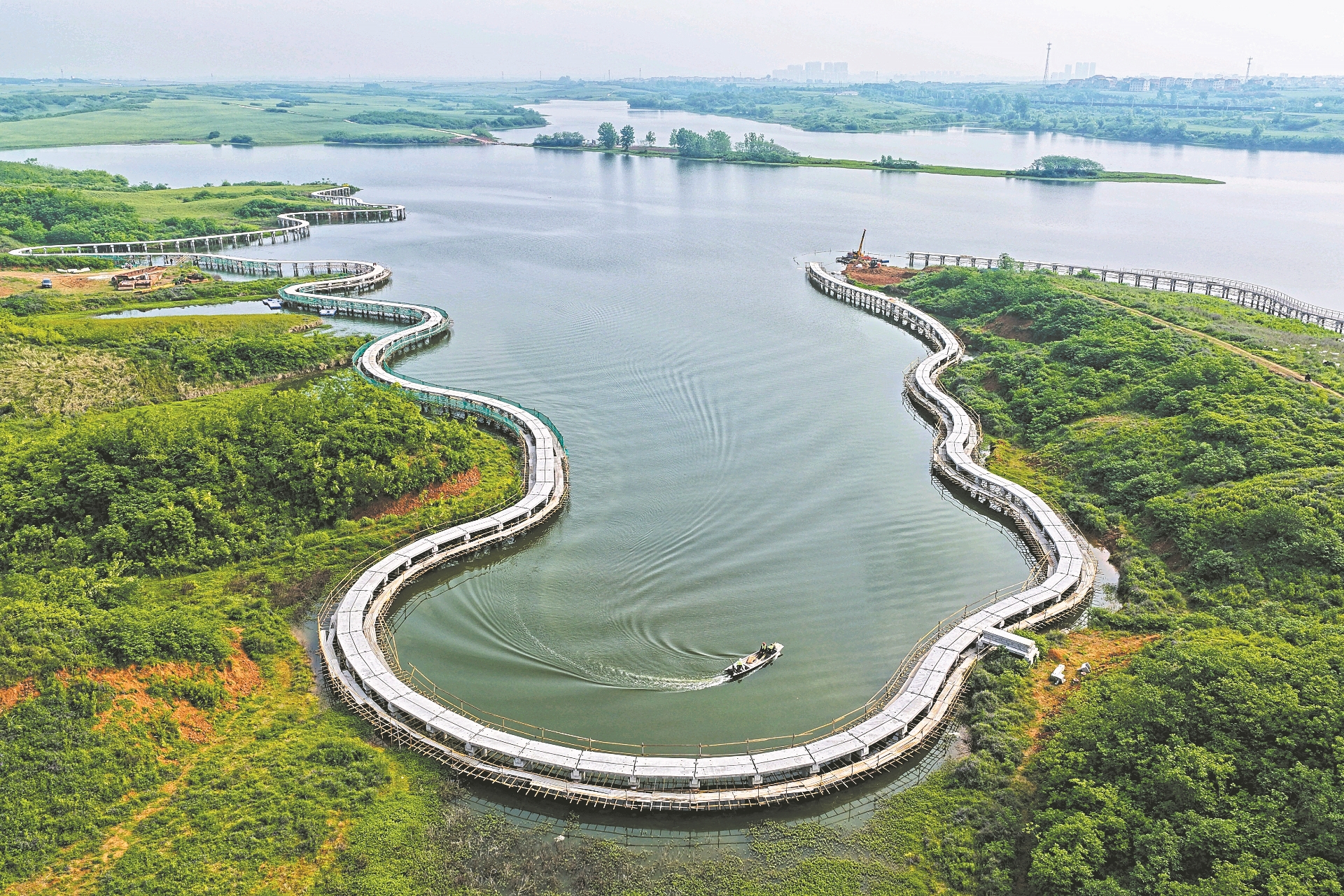 4月23日,工人在樊城区普陀堰水库加紧建设水上景观栈道。该栈道位于樊城区乡村振兴旅游公路“一号公路”起点,全长约1.6公里。当地积极推动“交通+旅游”融合发展,通过打造水上景观项目,提升沿线风貌,丰富旅游体验,进一步吸引游客前来观光游玩。