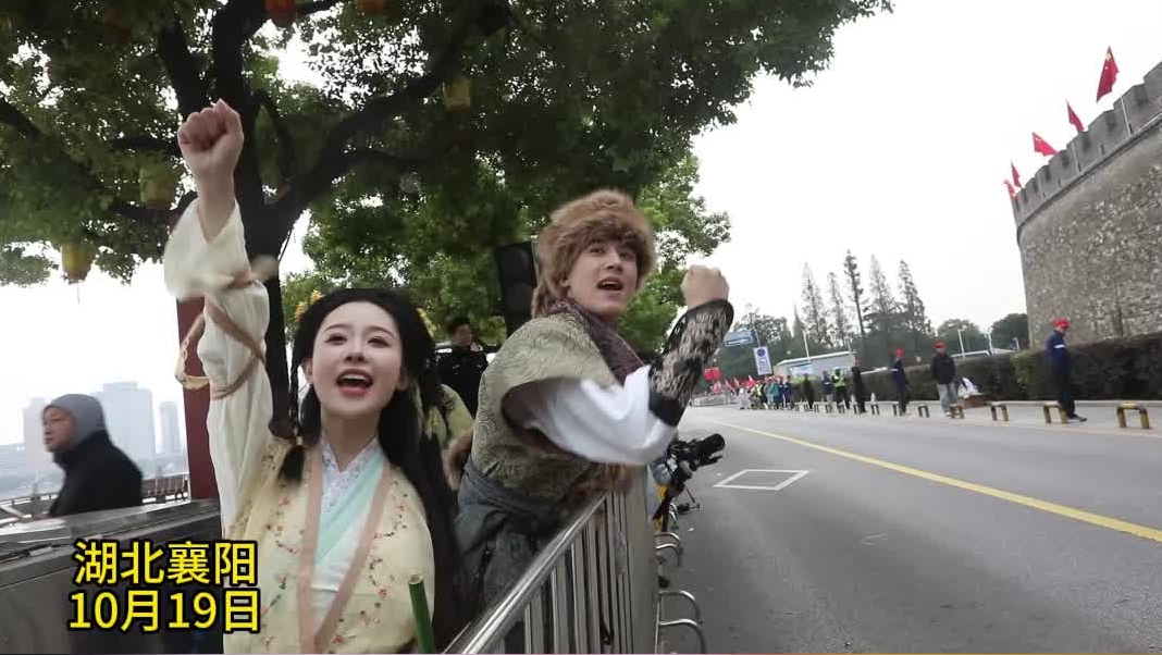 2025襄阳马拉松,参赛选手在五公里打卡点和“郭襄”小姐姐拍照合影
