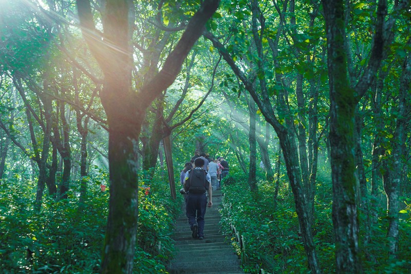 山中的狭径,通往石垴岭高处,秋花覆锦于山脊,保康特有的耳叶凤仙花像春扇打开,在如丝缎般柔滑的青苔上落下斑驳影迹,画风清奇。远山风车转动,薄云清隽,阳光不刺眼,风儿也清凉。