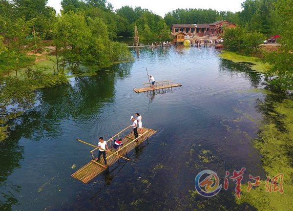 5月13日,游客在宜城市流水镇莺河村村头的小河里撑竹筏,游览小村风光。