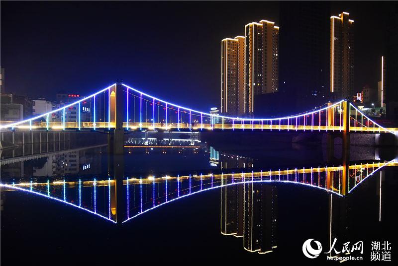 2019年2月5日晚,游客在湖北省保康县城清溪河景观桥上自拍。春节期间,地处鄂西北山区的保康县城处处张灯结彩,到处洋溢着喜庆的节日气氛。