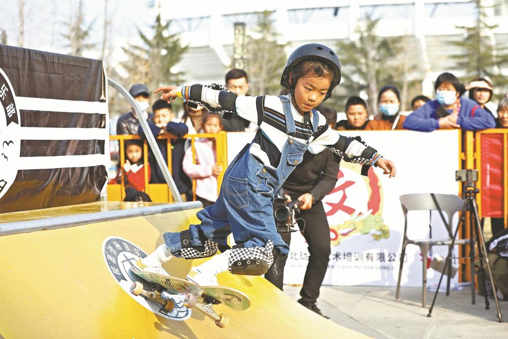 11月28日,在全民健身中心,小选手在进行滑板比赛。