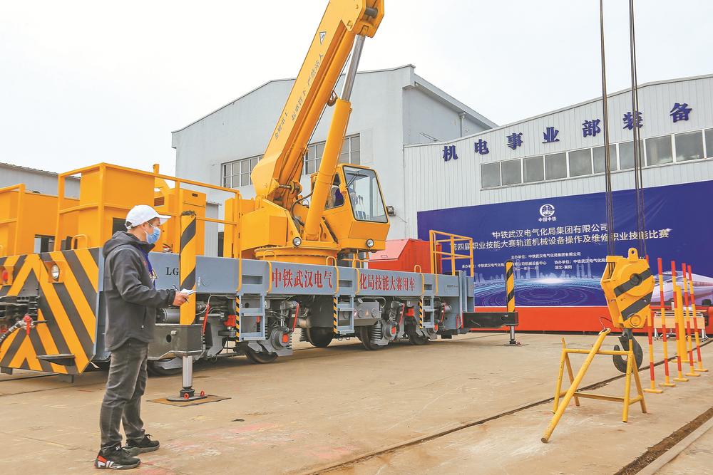 11月28日,参赛选手在进行轨道车吊装比赛。