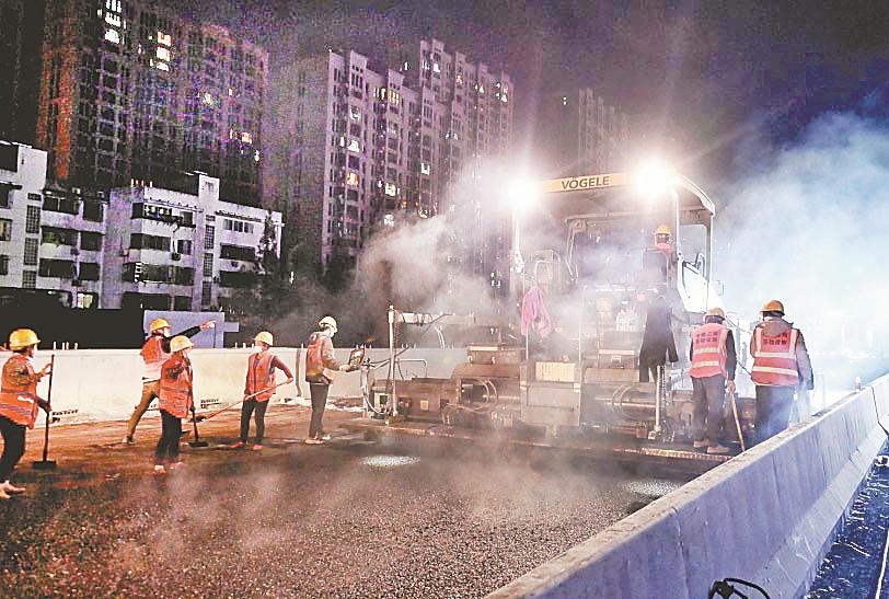 11月26日晚,施工人员在东西轴线樊城段挑灯夜战忙施工。