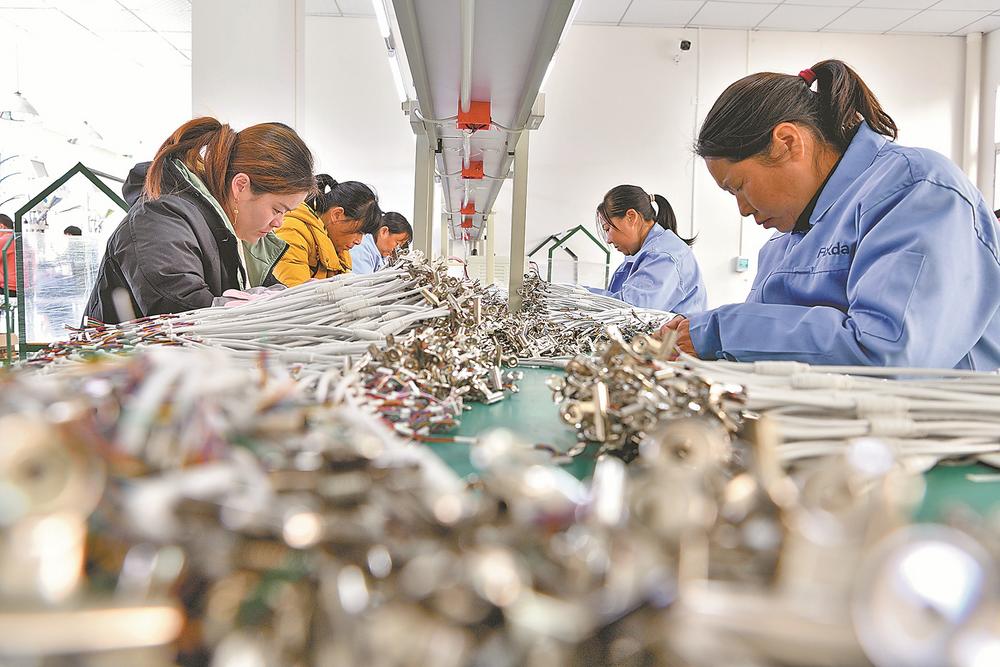 11月19日,在保康县歇马镇河东村一微工厂,村民在加工电子产品.