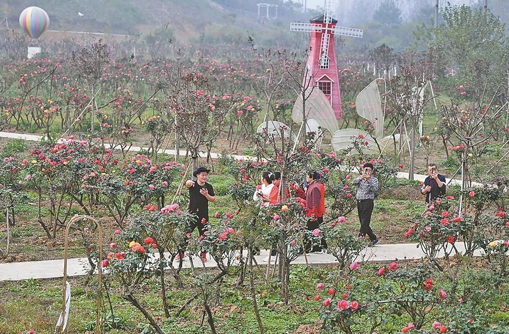 近日,游客在襄城区卧龙镇朝阳村卧龙月季园游玩。